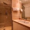 A seguire ecco la camera padronale, con letto matrimoniale, TV e bagno in camera. Gli armadi sono stati realizzati su misura richiamando le forme curve delle volte. Il bagno en-suite è dotato di doccia con un grande soffione cromato a soffitto.