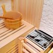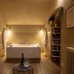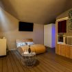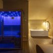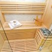 Accanto alla sala benessere si trova una sauna a due posti, la vasca idromassaggio e un bagno con doccia. Da questa camera parte un’altra scala che risale al soggiorno.