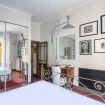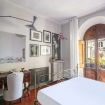 White master bedroom: the master bedroom, with en-suite bathroom, hosts a pleasant brass king-size bedframe and is furnished with a desk, an armchair and a large cabinet style wardrobe. A French window opens onto a small balcony filled with plants that looks on the internal courtyard, with views of several nice terraces and balconies. The en-suite bathroom tiled in off-white marble has a built-in basin, WC, bidet and bathtub with shower attachment.