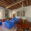 There is also a queen size sofa bed and its own ensuite bathroom with shower. Stepping out of the entrance room, with four ample windows at the corner between via Bocca di Leone and via Borgognona, there is the large living room, with comfy sofas and ottoman armchairs, a long antique dining table that seats eight, lit by a crystal chandelier, a desk and two antique consoles. There is also a flat screen TV in the corner.