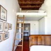 Flowers bedroom: this twin bedroom has a large single bed and a second queen size loft bed accessed by a ladder with safety rails. There is a wall light in the loft area for reading at night. The room has a built-in wardrobe, and a pass-par-tout wall shelf.