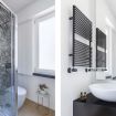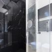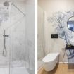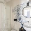 Il parquet in rovere naturale impermeabile è presente anche nei bagni, così come è impermeabile la scenografica carta da parati che decora le docce e le principali pareti dei bagni.