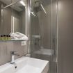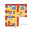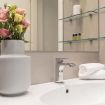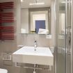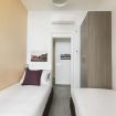 Three bedrooms are located off the living room: one bedroom with two single beds, a triple room composed of one double bed and a single bed, and a third bedroom with a double bed. There are two baths; both are finished with resin wall and floor treatments, and feature showers and contemporary fixtures. One of the baths is ensuite in the double bedroom.